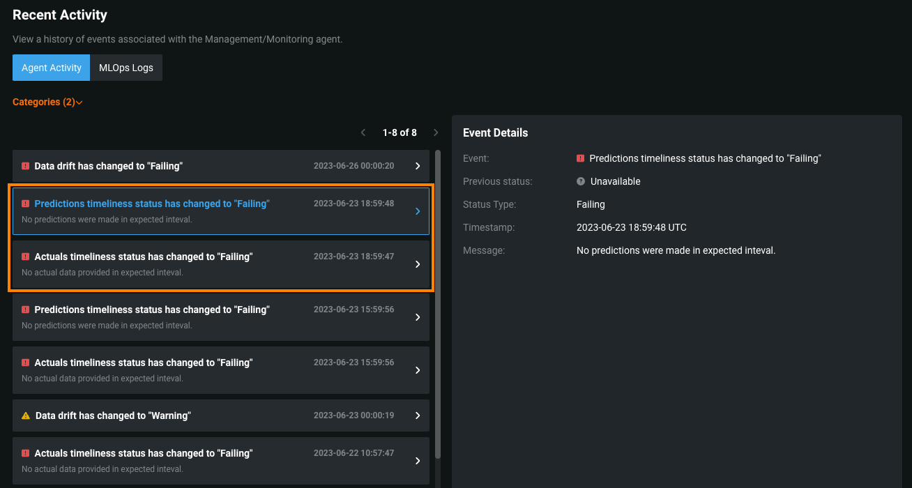 On the Service Health tab, under Recent Activity, view timeliness status events in the Agent Activity log: