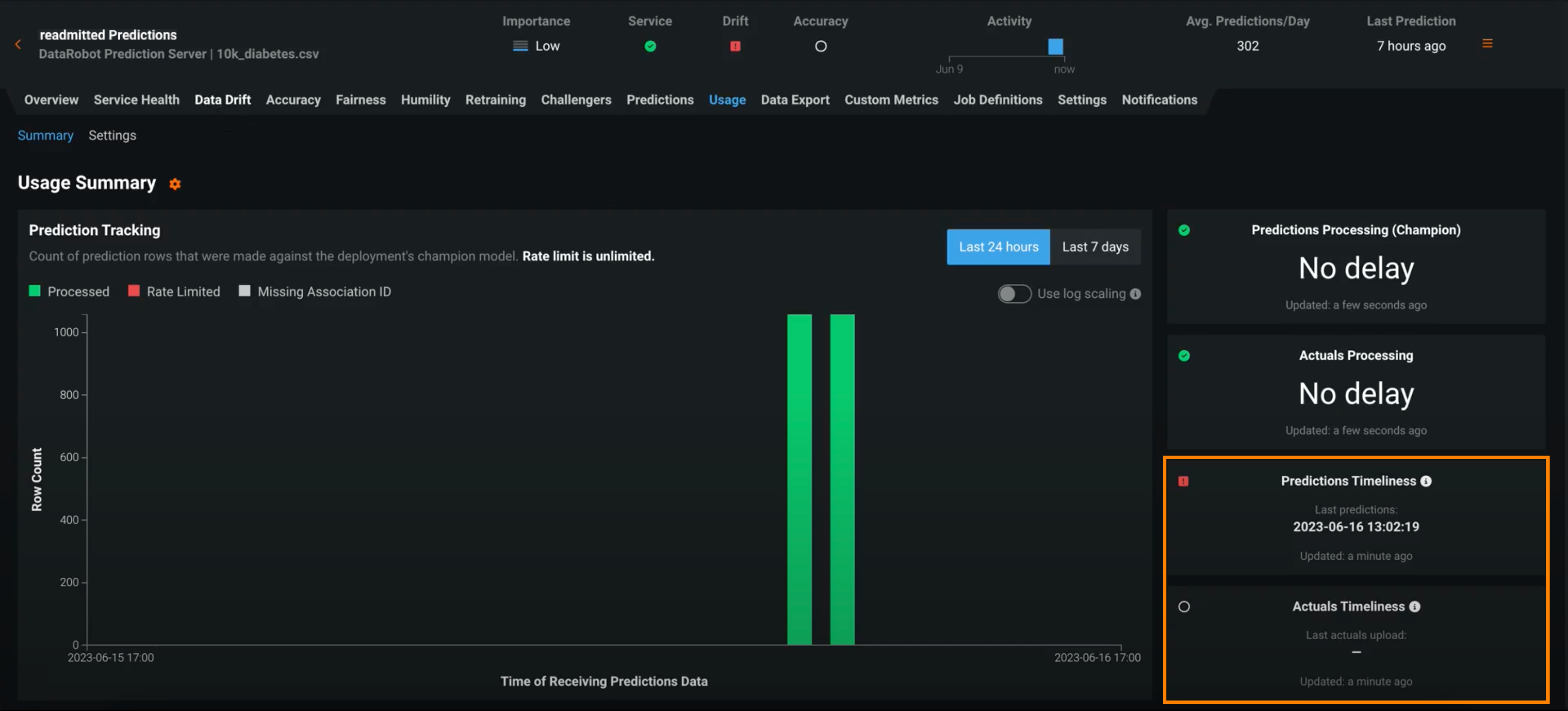 On the right side of the Usage tab are the processing delays for Predictions Processing (Champion) and Actuals Processing (the delay in actuals processing is for ALL models in the deployment):