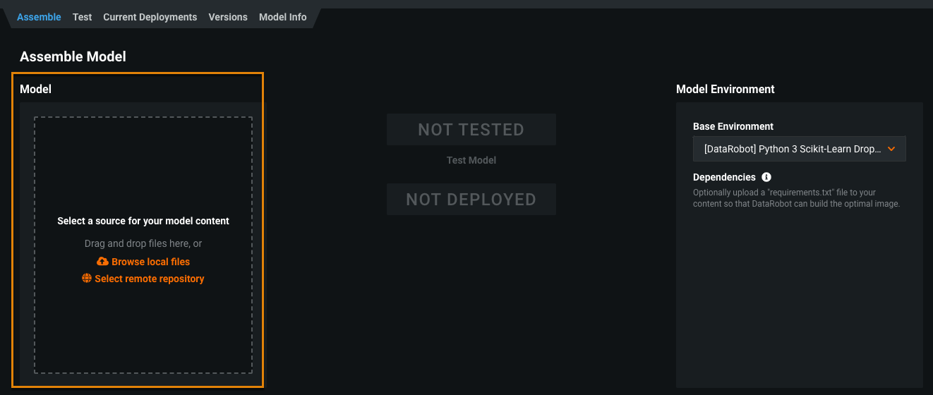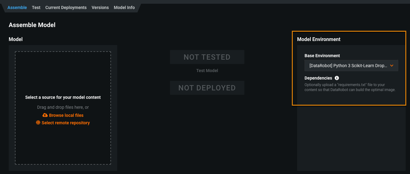On the right side of the Assemble tab, under Model Environment, select a model environment from the Base Environment list. The model environment is used for testing and deploying the custom model.