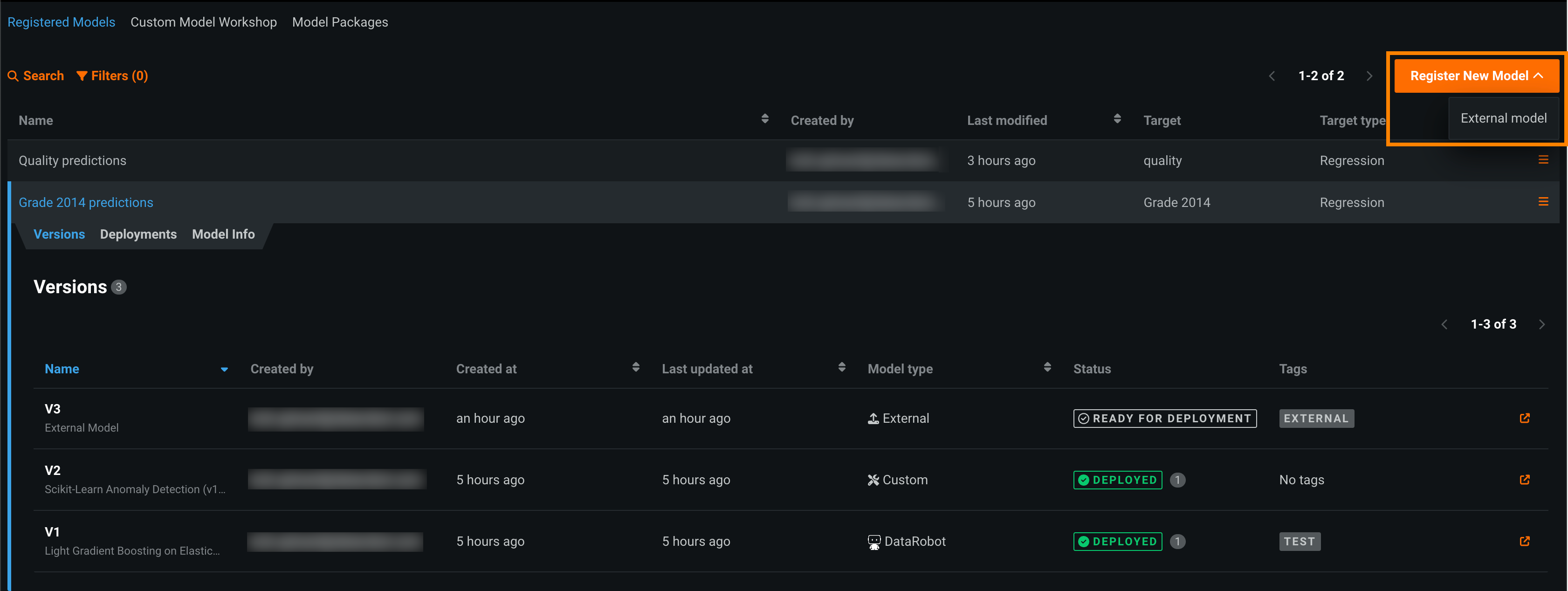 Click Model Registry and on the Registered Models tab, click Add new package and select New external model package.