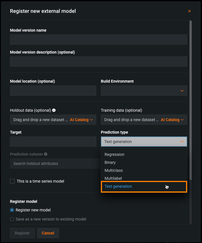 In the Register new external model dialog box, from the Prediction type list, click Text generation and add the required information about the agent-monitored generative model. To provide a training baseline for drift monitoring, in the Training data field, you should upload a dataset containing at least 20 rows of prompts and responses relevant to the topic your generative model is intended to answer questions about. These prompts and responses can be taken from documentation, manually created, or generated.