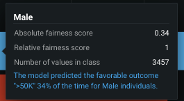 Hover over a class to see additional details, including both absolute and relative fairness scores, the number of values for the class, and a summary of the fairness test results.