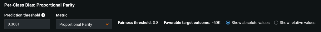 Select Show absolute values to display the raw score each class received for the selected fairness metric.