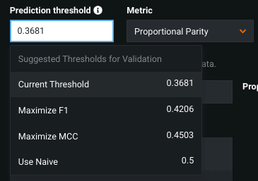 All fairness metrics (except prediction balance) use the model's prediction threshold when calculating fairness scores. Changing this value recalculates the fairness scores and updates the chart to display the new values.
