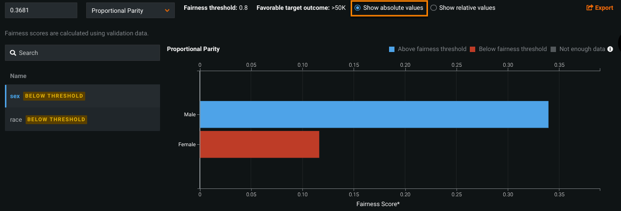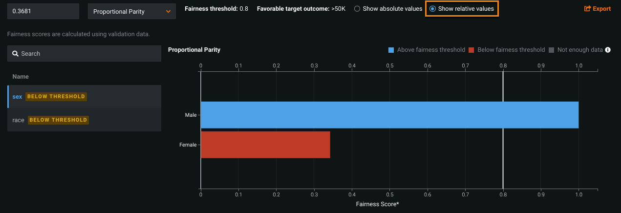 Select Show relative values to scale the class with the highest fairness score to 1, and scale all other class fairness scores relative to 1.