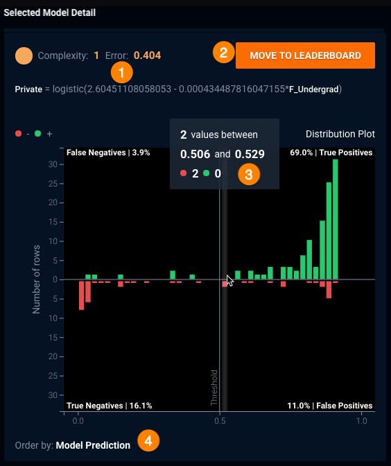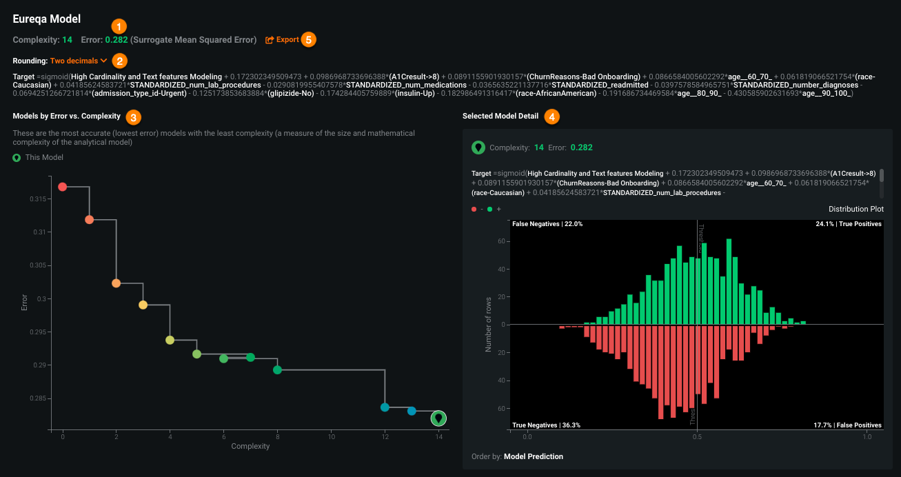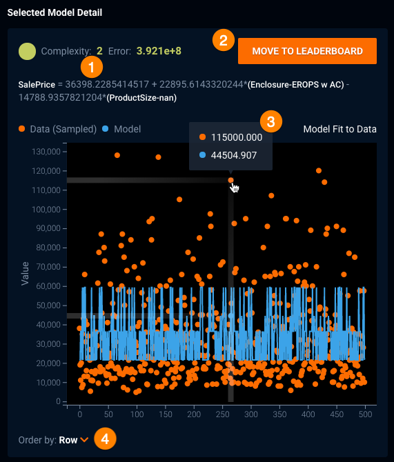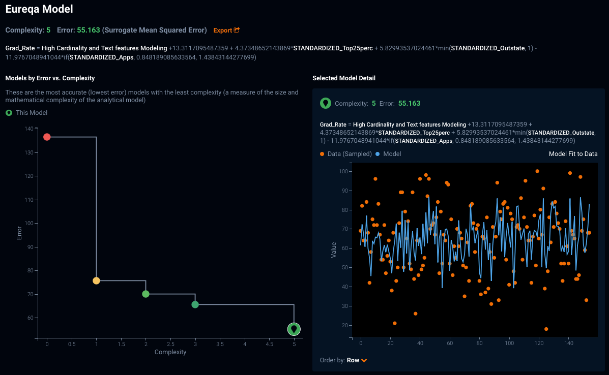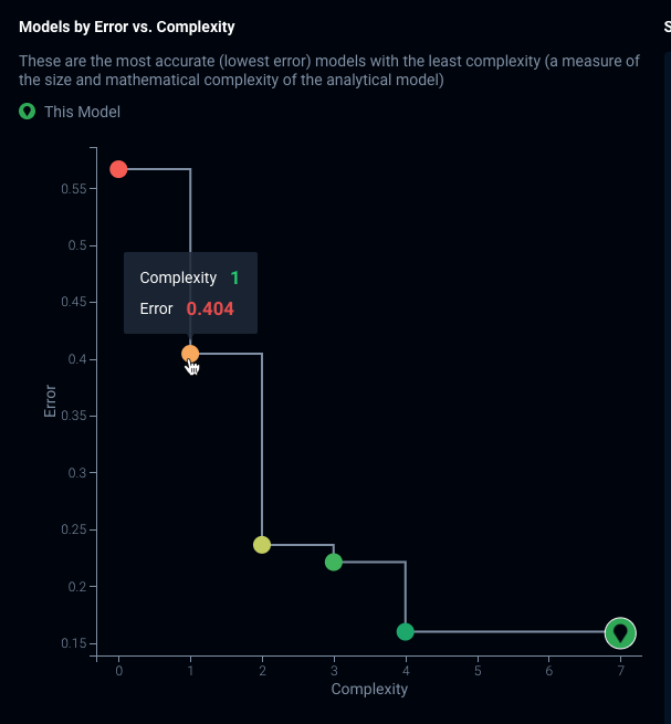 The Selected Model Detail graph reports, for the selected model, the complexity and error scores, as well as the mathematical representation of the model.