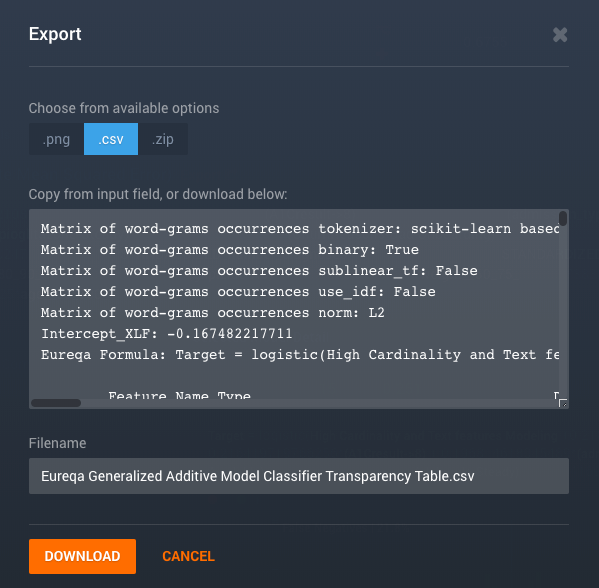 The Export button opens a window allowing you to download the Eureqa preprocessing and parameter table for the selected Leaderboard entry. This export provides all the information necessary to recreate the GAM model outside of DataRobot. Interpret the output in the same way as you would the export available from the Coefficients tab (with GAM-specific information here), with the following differences: