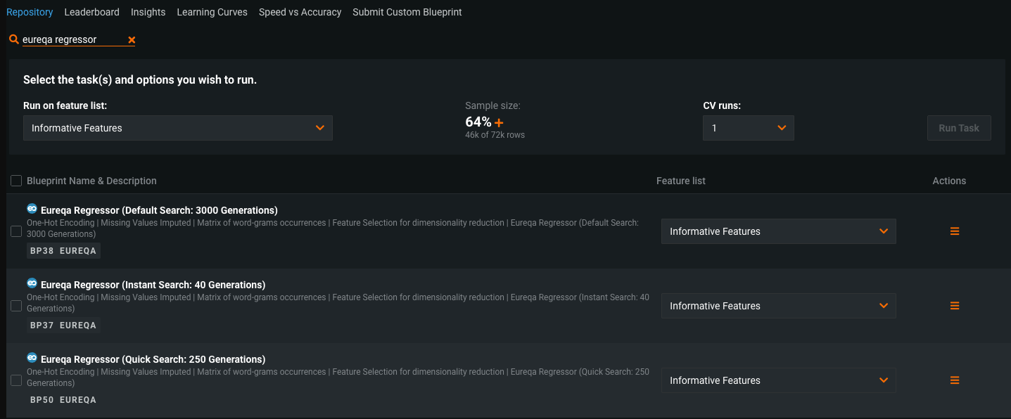 If you ran Quick mode and Eureqa models were not built, or you chose manual mode, you can create them from the Repository. For Comprehensive mode, all Eureqa models are created during Autopilot. Running a Eureqa blueprint creates a model of that name.