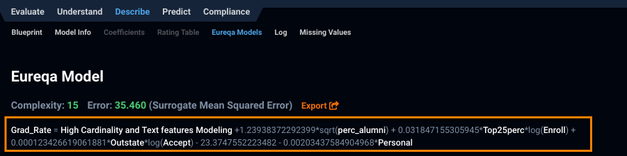 The complexity score reports the complexity of this model, as represented in the Models by Error vs. Complexity chart. The "Eureqa error" value provides a mechanism for comparing Eureqa models. Once you have selected the best-suited model, you can move that model to the Leaderboard to compare it against other DataRobot models. The model expression denotes the mathematical functions representing the model. The Export link opens a dialog for downloading model preprocessing and parameter data. See this note on data partitioning and error metrics.