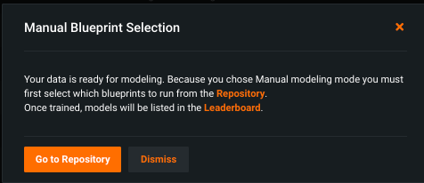 Click Repository in the message or select Repository from the menu to add a Eureqa blueprint. (Note that Autopilot mode automatically creates a Eureqa generalized additive model and makes it available from the Leaderboard.)