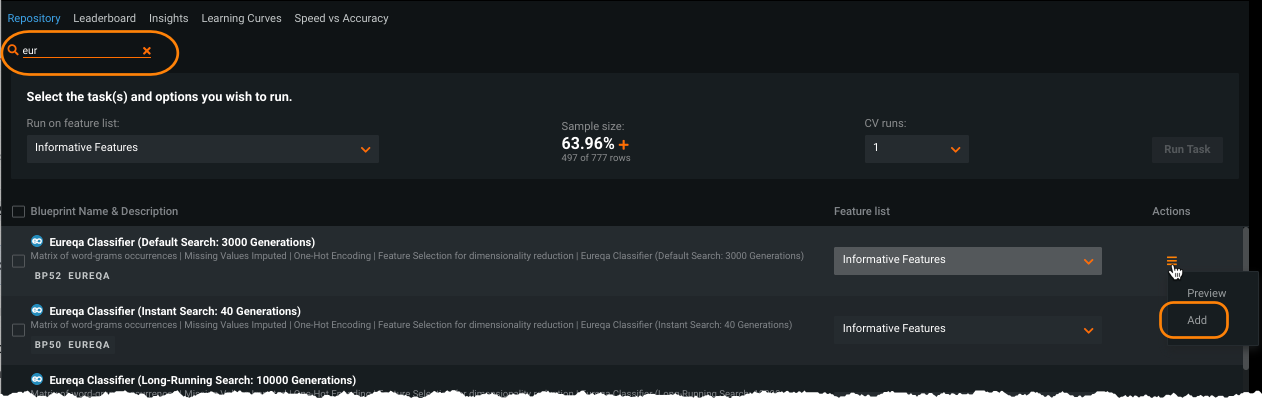 eureqato filter the display. Click Add from the dropdown for each Eureqa model you want to create.