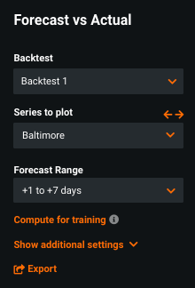 The Forecast vs Actual chart has many similarities to the Accuracy Over Time chart in its display controls. Other than the Forecast Range control (Forecast Distance in Accuracy Over Time) the following work the same.