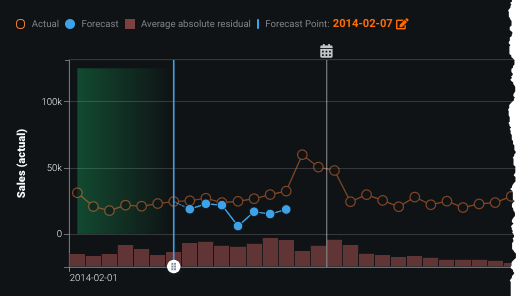 Forecast vs Actual allows you to compare how different predictions behave from different forecast points to different times in the future. Use the chart to help answer what, for your needs, is the best distance to predict. Forecasting out only one day may provide the best results, but it may not be the most actionable for your business. Forecasting the next three days out, however, may provide relatively good accuracy and give your business time to react to the information provided. If your project included calendar data, those events are displayed on this chart, helping you to gain insight into the effects of those events.