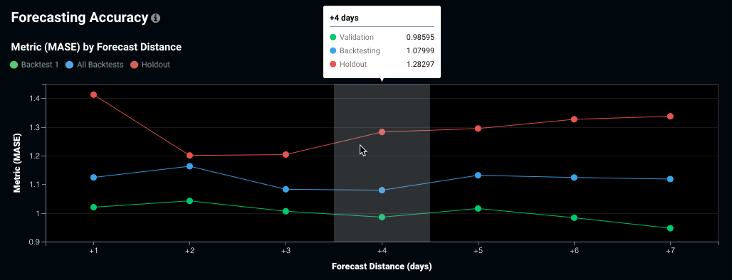 The Forecasting Accuracy tab provides a visual indicator of how well a model predicts at each forecast distance in the project's forecast window. It is available for all time series projects (both single series and multiseries). Use it to help determine, for example, how much harder it is to accurately forecast four days out as opposed to two days out. The chart depicts how accuracy changes as you move further into the future.