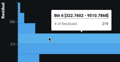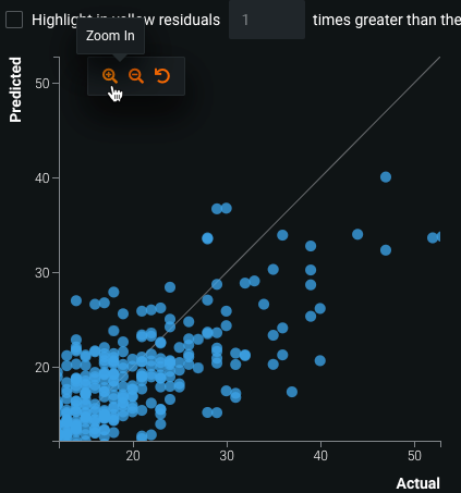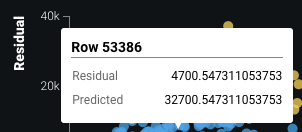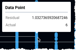 Hovering over individual points on the plots displays the Data Point bin. The bin allows you to compare the predicted or residual values to the actual values for a given blue dot. For the predicted vs actual plot, hover over a specific dot to compare how far the predicted value (represented by the blue dot) differs from that specific actual value (represented by the gray line).