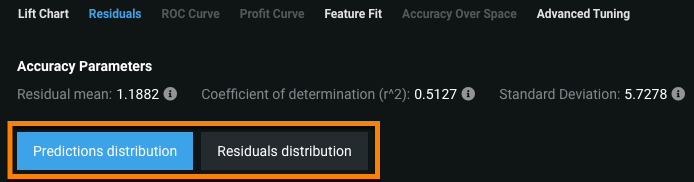 From the Residuals tab, you can access each plot by selecting the appropriate distribution: Predictions or Residuals.