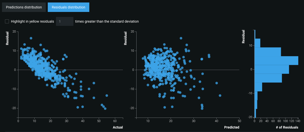 The Residuals tab is designed to help you clearly understand the predictive performance and validity of a regression model. It allows you to gauge how linearly your models scale relative to the actual values of the dataset used.
