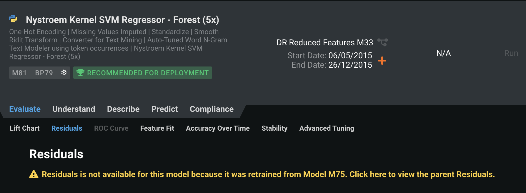 Note that the Residuals tab is not available for frozen run models if there are no out-of-sample predictions. You are redirected to the Residuals tab of the parent model.