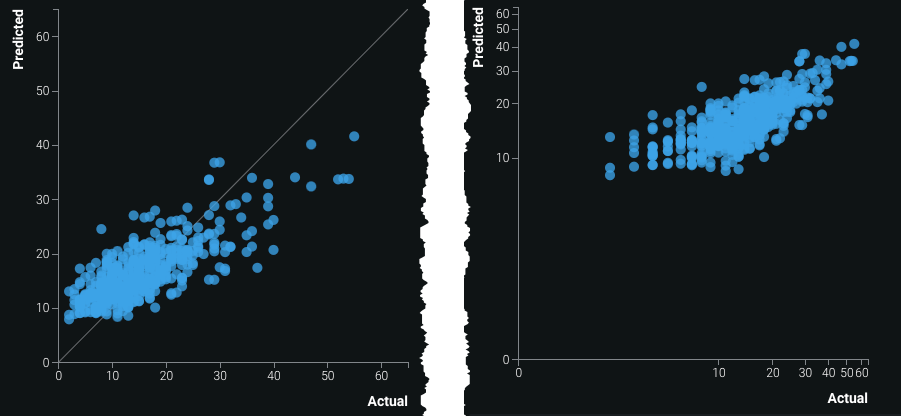 For example, compare the Predicted vs. Actual plot with linear scaling (left) to log scaling (right):