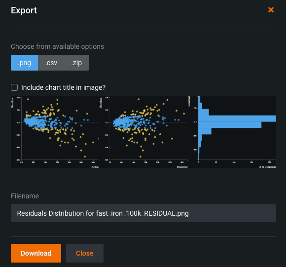 Because these plots are created as part of the model fit process, this tab is only accessible for models created with version 5.2 and later (or after 7/1/2019 for managed AI Platform users). You must manually re-run existing models to view the Residuals tab for them. Additionally, the Residual vs Predicted plot and the Residuals histogram are only available for version 5.3 and later (or after 11/13/2019 for managed AI Platform users).