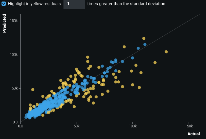 For the Residual vs Actual plot, hover over a specific point to see the exact residual value for a given actual value. Each dot's coordinates are based on these values (residual for the y-axis coordinate and actual for the x-axis coordinate), and the distance from the horizontal gray line indicates the difference between the predicted and actual values. The greater the difference, the further a point is from the line.