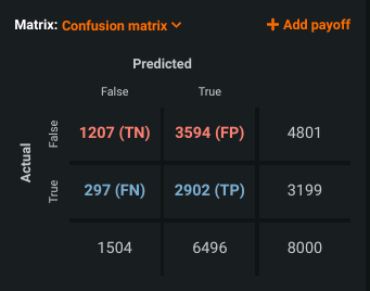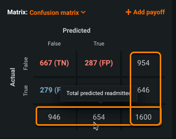 If you hover over a cell in the matrix (for example, the True Negative cell in the top left), you can see the total count as a numeric or percentage (total count as a numeric shown here):