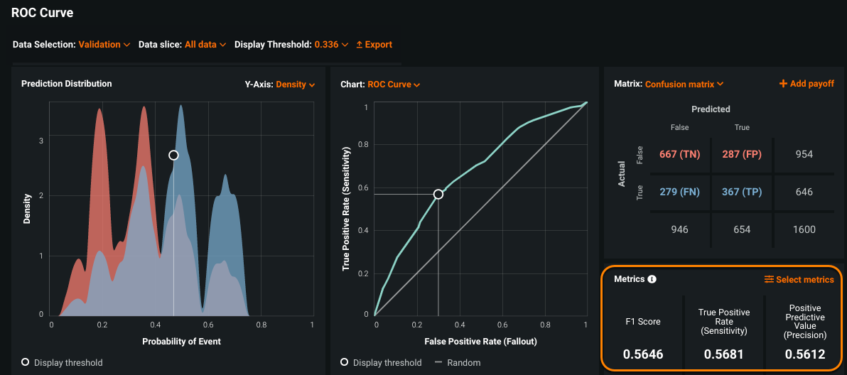 The Metrics pane initially displays the F1 Score, True Positive Rate (Sensitivity), and Positive Prediction Value (Precision). You can set up to six metrics.