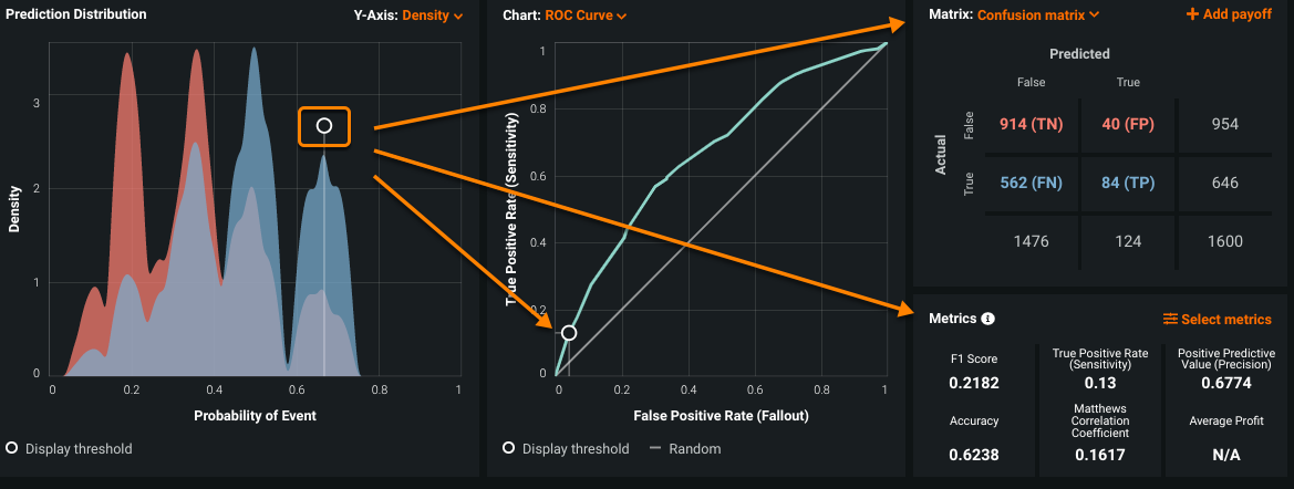 The new value appears in the Display Threshold field. The circle and intercept lines on the Prediction Distribution graph update to the new threshold value. The Metrics pane, the Chart pane (set to ROC Curve here), and the Matrix pane (set to Confusion matrix here) also update to reflect the new threshold.