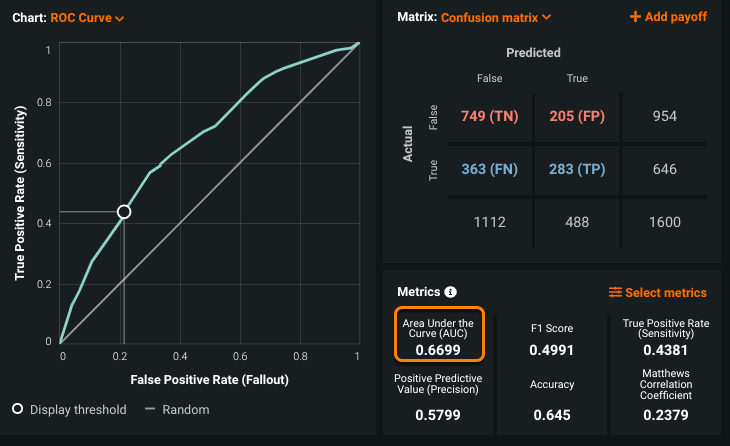 AUC does not display automatically in the Metrics pane. Click Select metrics and select Area Under the Curve (AUC) to display it.