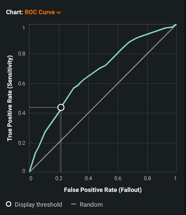 The ROC curve visualization (on the ROC Curve tab) helps you explore classification, performance, and statistics for a selected model. ROC curves plot the true positive rate against the false positive rate for a given data source.