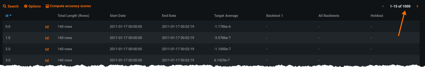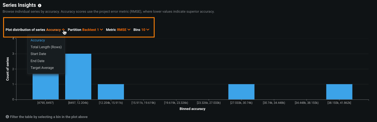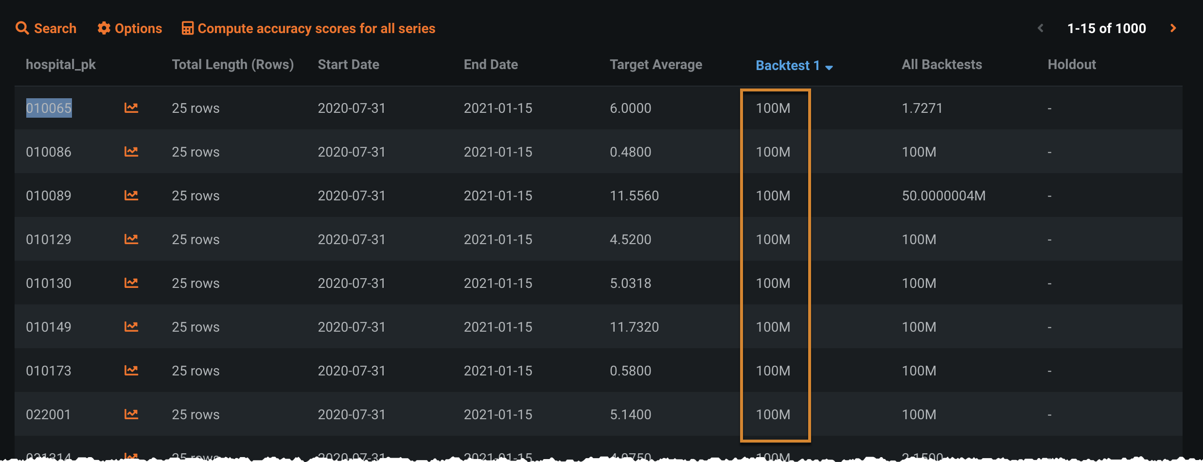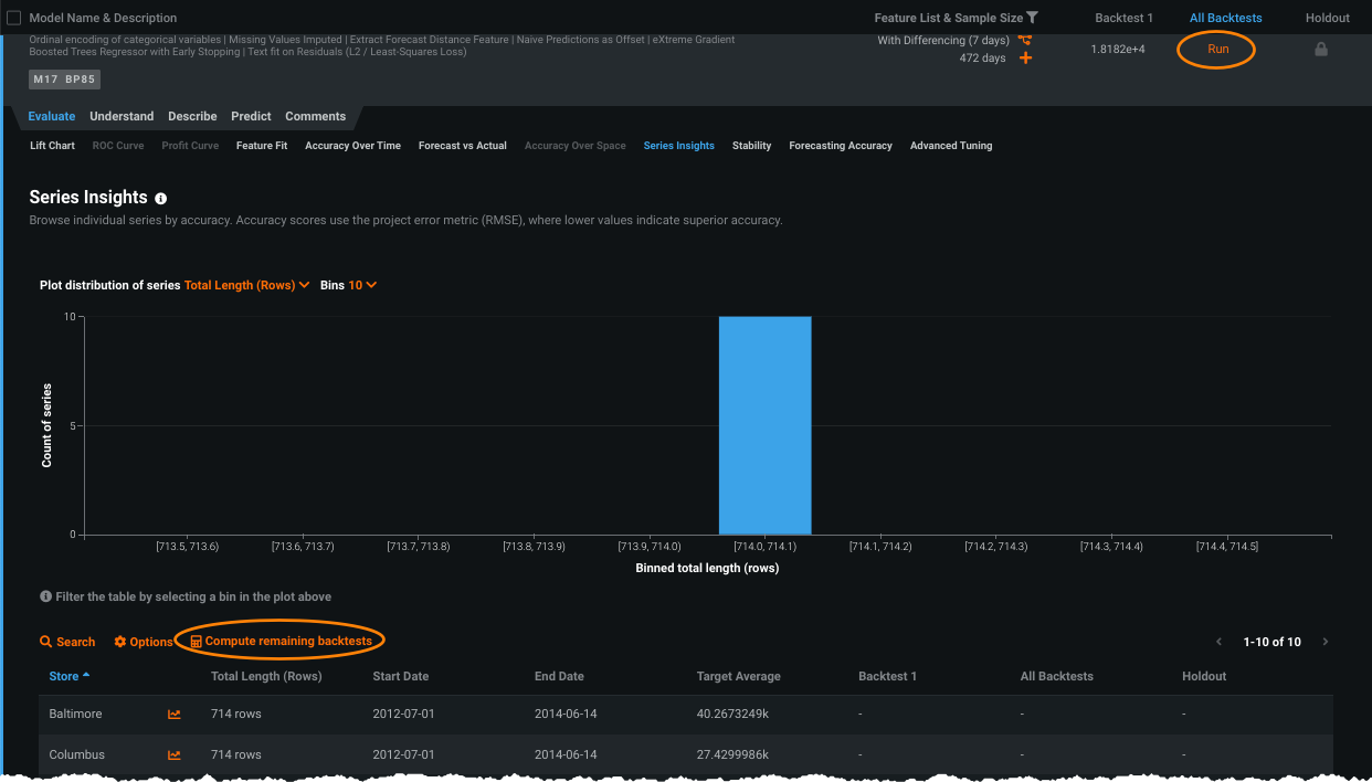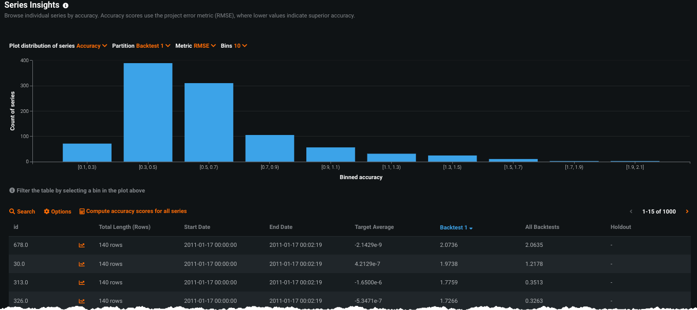 To speed processing, Series Insights visualizations are initially computed for the first 1000 series (sorted by ID). You can, however, run calculations for the remaining series data. As each new calculation is computed, additional details become available. Complete information depends on accuracy calculations for all backtests.