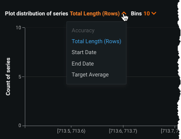 The histogram provides an at-a-glance indication of the series distribution (for the first 1000 series, regardless of whether all series are computed) based on a variety of metrics. Initially you can set the distribution to length, start or end date, or target average. Use the dropdowns to set the method and the number of bins for the display. When you have calculated accuracy, selecting that distribution adds options.
