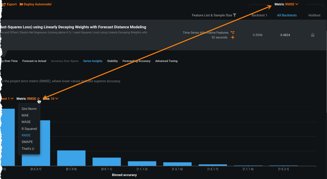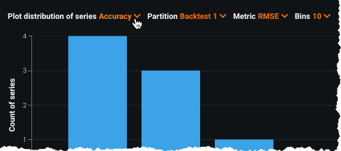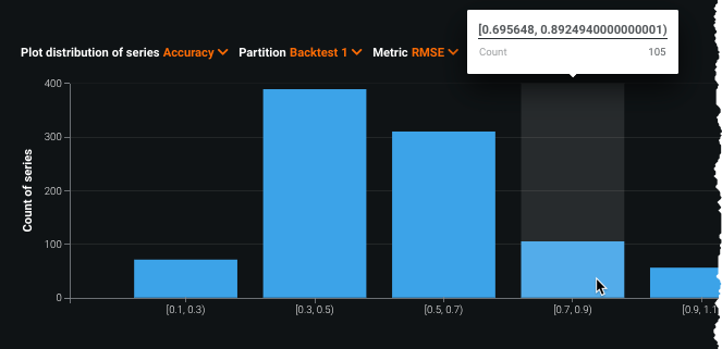Hover on a bin to show a tooltip that displays series counts and binned value. In this example, when displayed for accuracy, 105 series had scores between (roughly) .69 and .89 when the metric was RMSE: