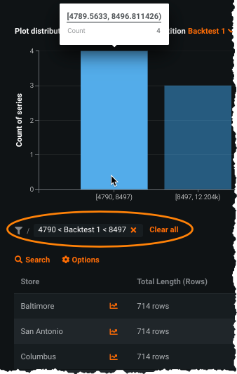 Clicking on a bin updates the table display to include results only for those series within the selected bin.