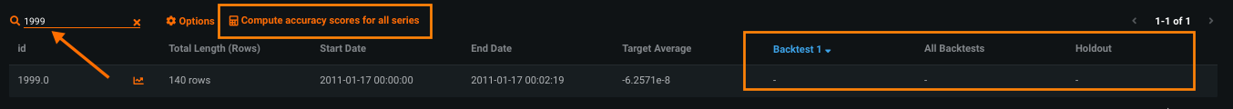 Use the search function to view metrics for any series. Note in the example below that additional accuracy scores have not yet been computed: