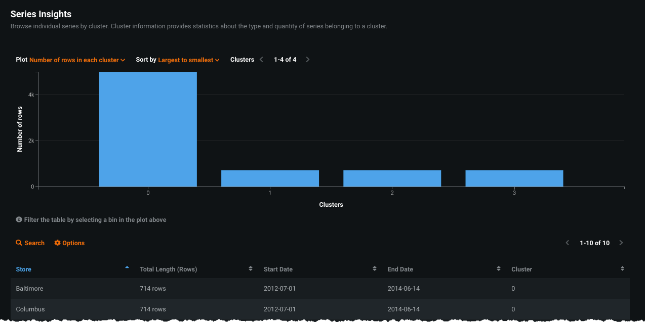 | 1 | Plot | Bins clusters by number of rows, percentage of total rows, or number of series in the cluster. To see all values, hover on a bin. |
