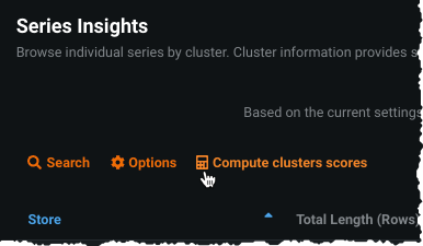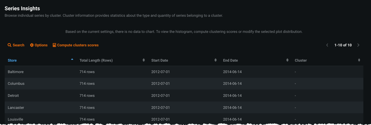The table below the histogram provides cluster-specific information for all series in the project dataset or, if filters are applied from the histogram, for series related to the selected clusters.