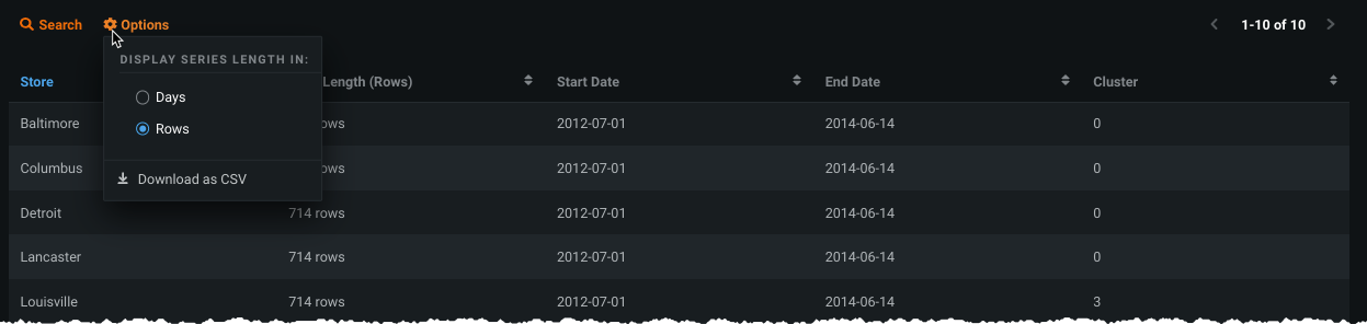 ) to set whether the series length information is reported as a time step or number of rows. Additionally, you can download the table data. - Note that the start and end dates display the first and last timestamps of the series in the dataset.