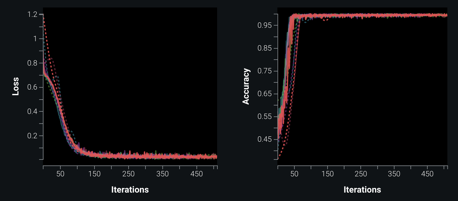 In the graphs above, the model gets very accurate around iteration 50 (exceeding 95%), and while the loss is still dropping by quite a bit, it is only half way to the bottom of the curve at iteration 50.