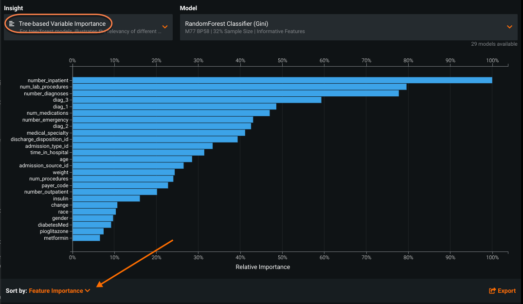 The Tree-Based Variable Importance insight shows the sorted relative importance of all key variables driving a specific model.
