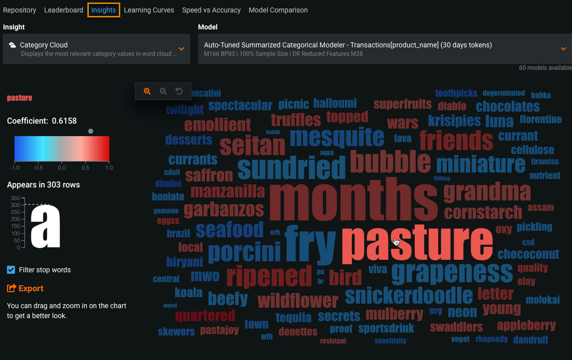 Click the Category Cloud tile on the Insights tab to investigate summarized categorical features. The Category Cloud displays as a word cloud and shows the keys most relevant to their corresponding feature.