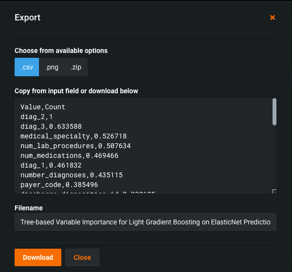 Click Export on the bottom right to download visualizations, then select the type of download (CSV, PNG, or ZIP).
