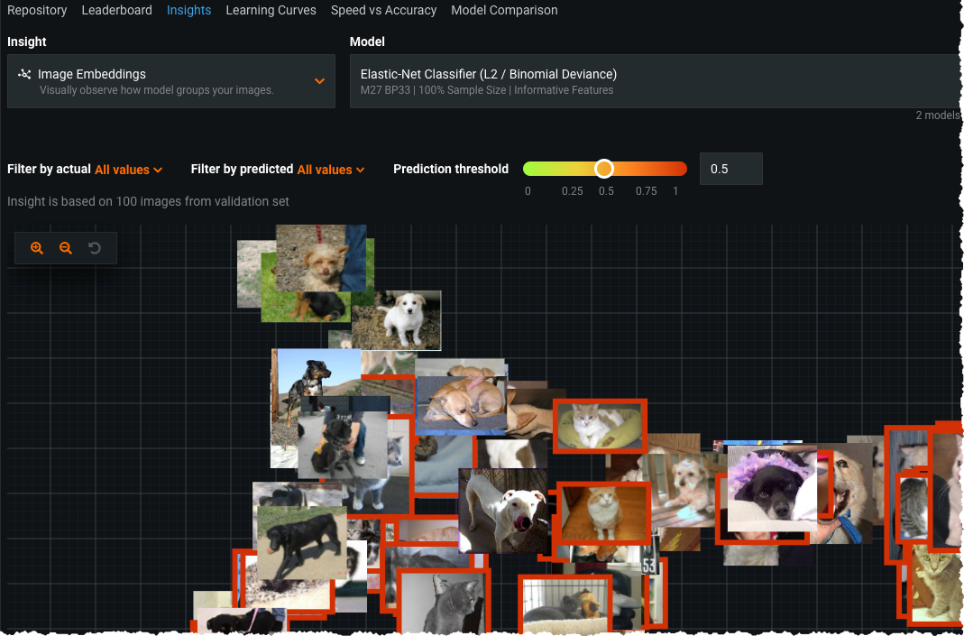 Click the Image Embeddings tile on the Insights tab to view up to 100 images from the validation set projected onto a two-dimensional plane (using a technique that preserves similarity among images). This visualization answers the questions: What does the featurizer consider to be similar? Does this match human intuition? Is the featurizer missing something obvious?