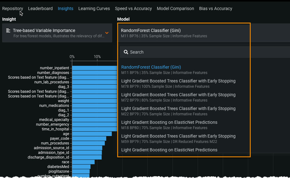 The models listed depend on the insight selected. In the example shown, the Tree-based Variable Importance insight is selected, so the Model list contains tree and forest models.