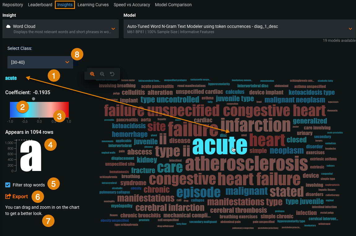 | 2 | Select Class | For multiclass projects, use the Select Class dropdown to choose a specific class for the text mining insights. |