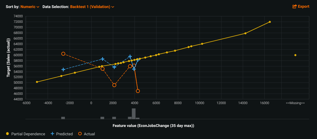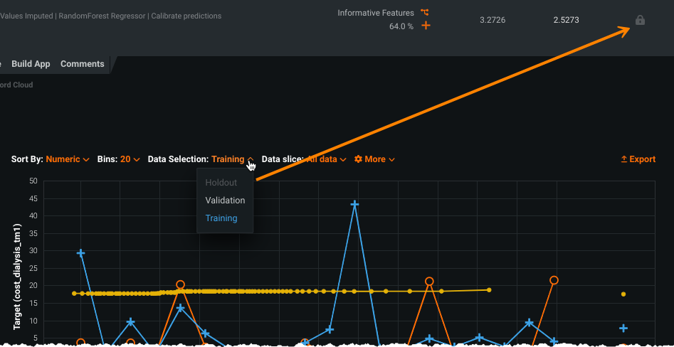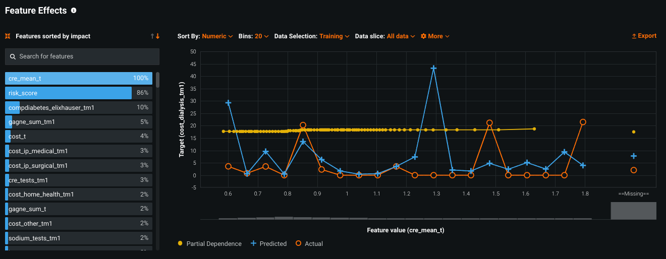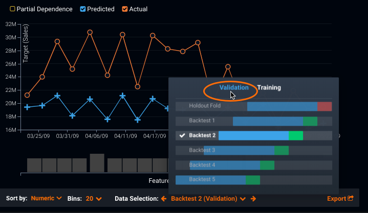 You can set the partition fold used for predicted, actual, and partial dependence value plotting with the Data Selection dropdown—Training, Validation, and, if unlocked, Holdout. While it may not be immediately obvious, there are good reasons to investigate the training dataset results.