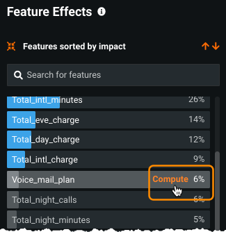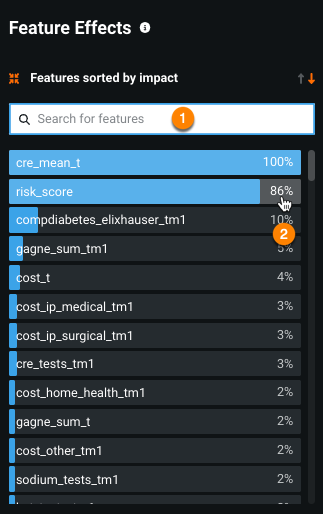 | 1 | Search for features | Lists of the top features that have more than zero-influence on the model, based on the Feature Impact (Feature Effects) score. |