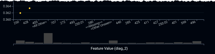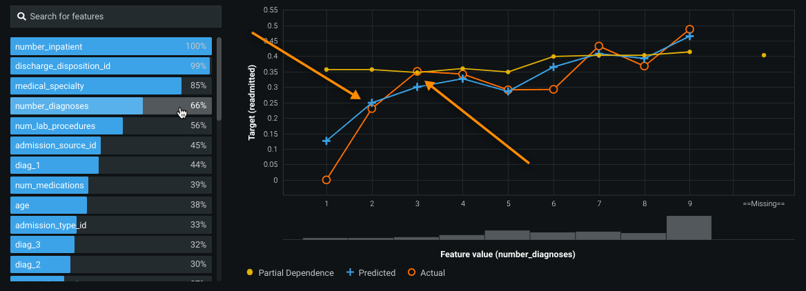 The orange open circles depict, for the selected feature, the average target value for the aggregated number_diagnoses feature values. In other words, when the target is readmitted and the selected feature is number_diagnoses, a patient with two diagnoses has, on average, a roughly 23% chance of being readmitted. Patients with three diagnoses have, on average, a roughly 35% chance of readmittance.