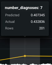 For the feature number diagnoses when the value is 7, the partial dependence average was (roughly) 0.407 and the actual values average was 0.432. These averages were calculated from 201 rows in the dataset (in which the number of diagnoses was seven). Select the Predicted label to see the the predicted average.