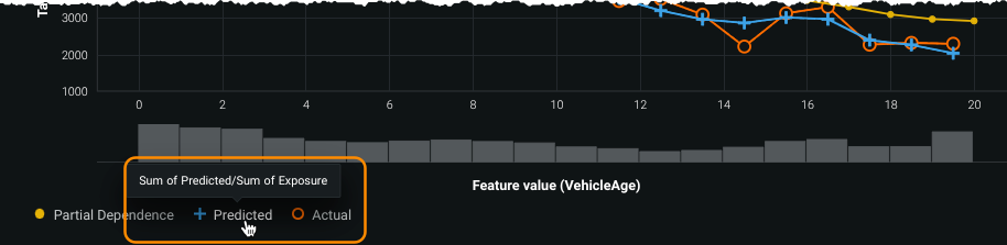 The orange line depicts the sum of the target divided by the sum of exposure for a specific value. The label and tooltip display Sum of Actual/Sum of Exposure, which indicates that exposure was used during model building.